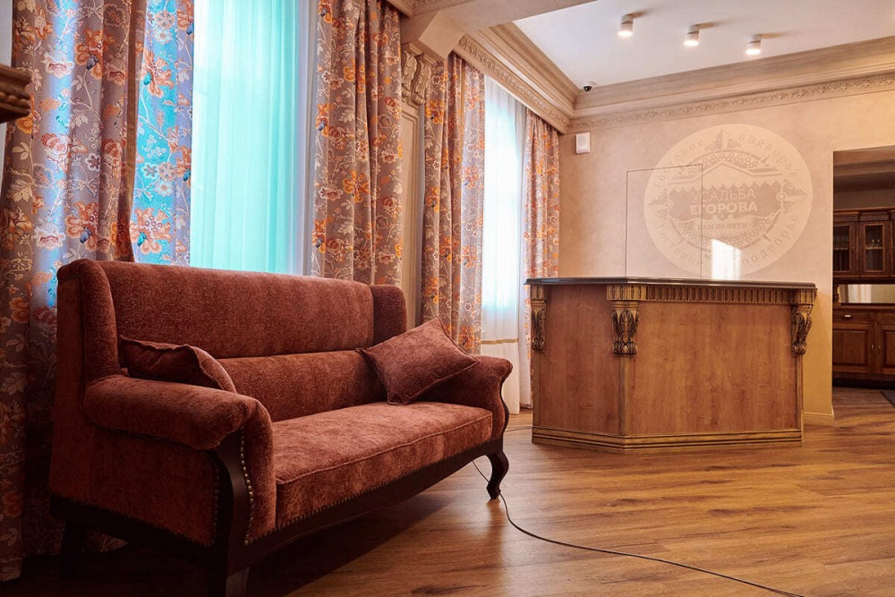 При оформлении бутик-отеля «Усадьба Егорова» целью стало воссоздание атмосферы купеческой роскоши и домашнего уюта. Неслучайно основным натуральным материалом в интерьере была выбрана древесина.