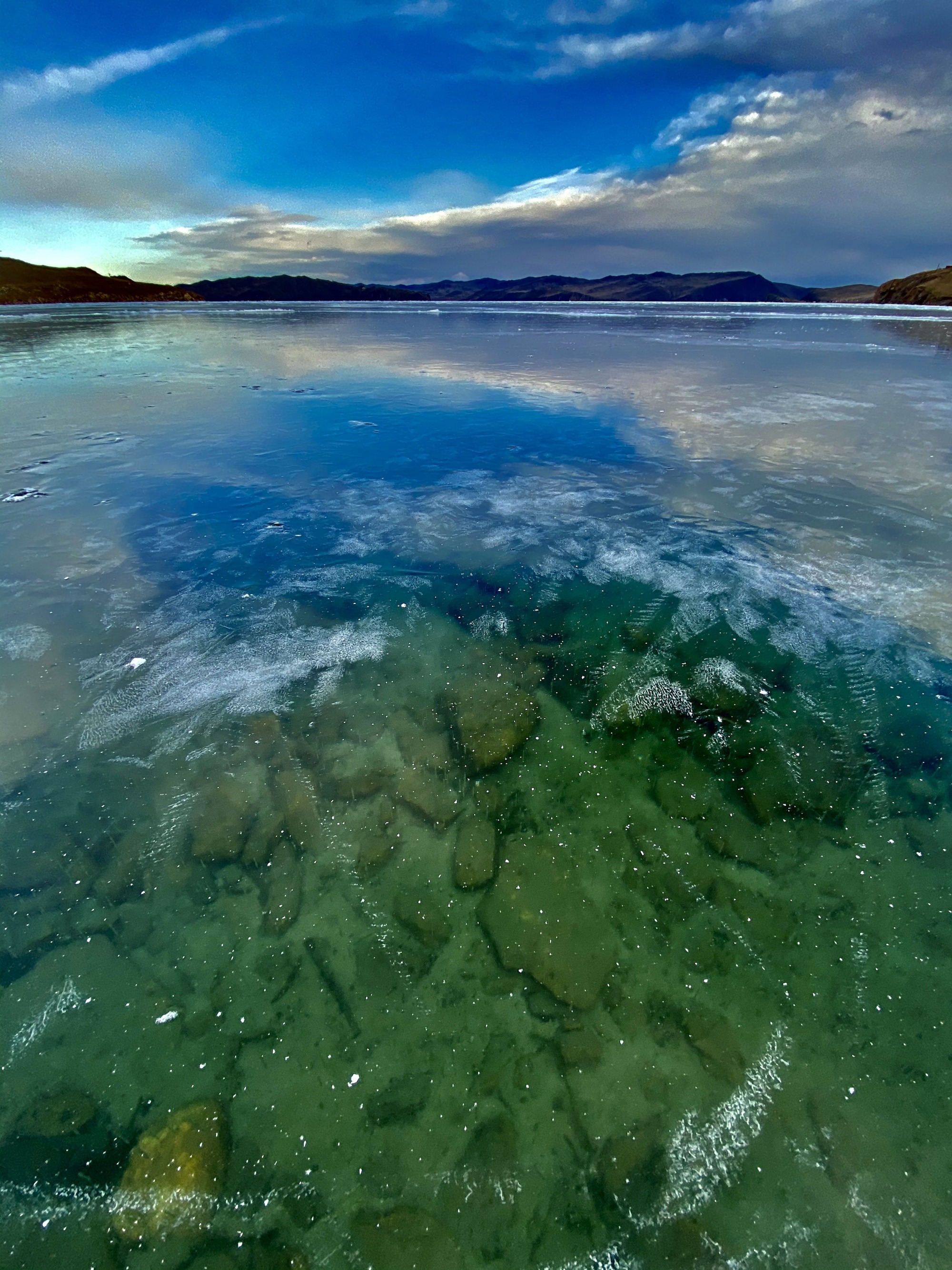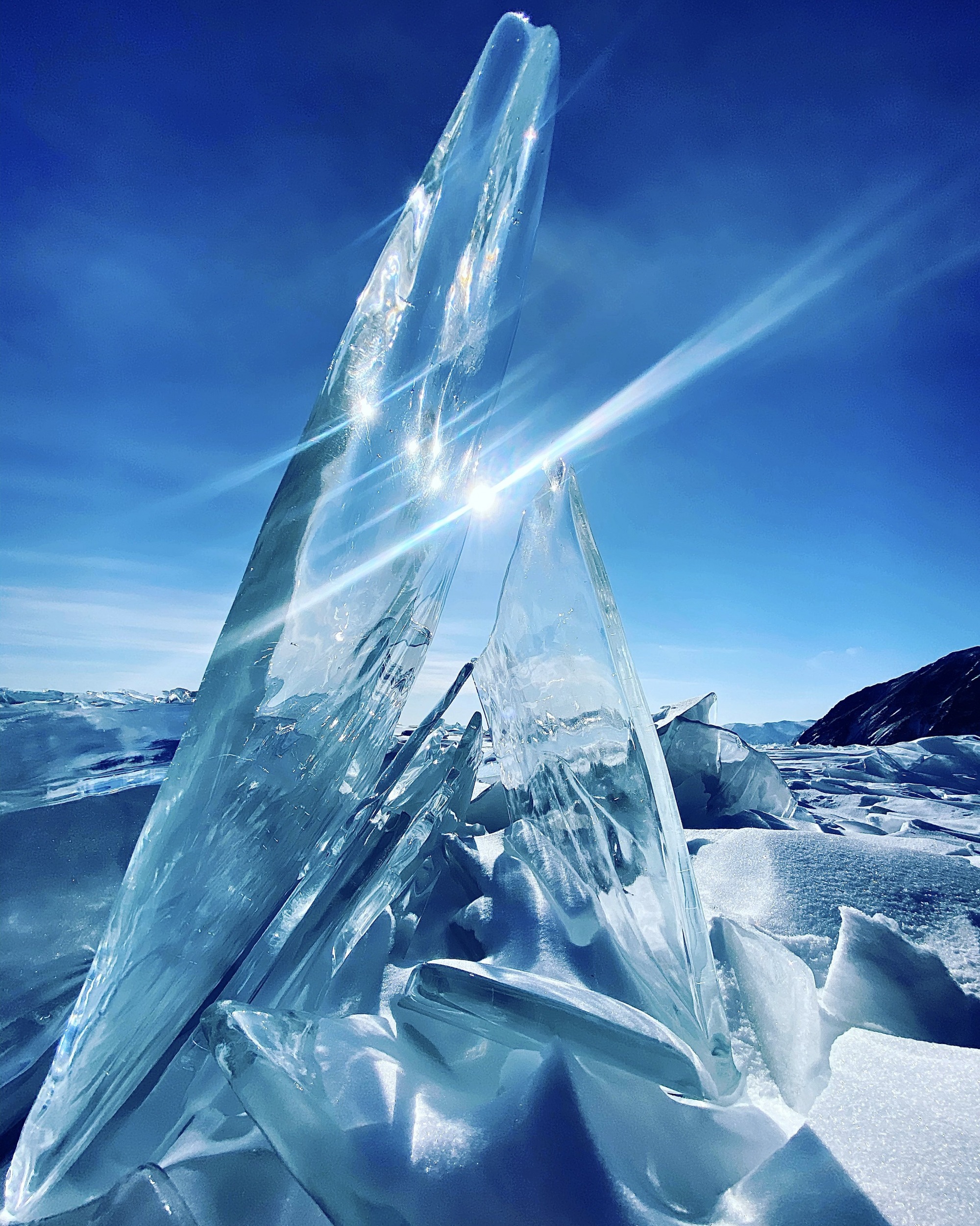 Здесь вы ощутите себя в полете по невероятному льду озера Байкал. Он сверкает бриллиантами, переливается от лазурного до глубоких зеленых оттенков.